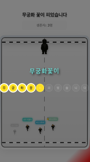 - 술래는 ‘무궁화 꽃이 피었습니다’를 한 음절씩 랜덤한 속도로 외치고, 다 외치면 뒤돌아 봅니다.