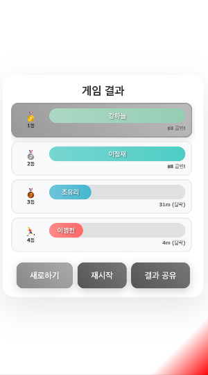 - 등수(순서)는 골인 여부 + 전진 거리 로 배정됩니다.